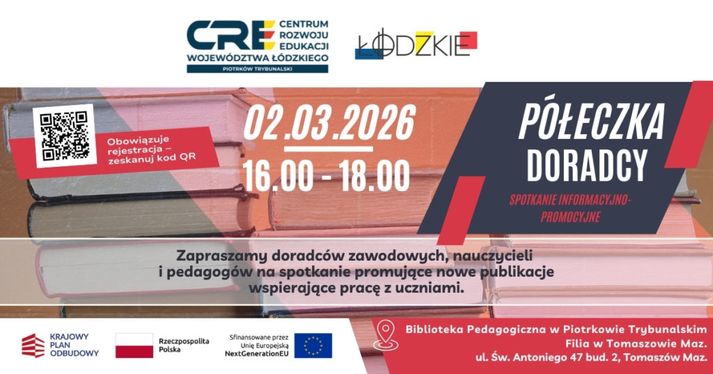 2 marca 2026 roku w Filii Biblioteki Pedagogicznej w Tomaszowie Mazowieckim odbyło się spotkanie promujące najnowsze działanie CRE WŁ w Piotrkowie Trybunalskim w ramach projektu LLL- „Półeczkę doradcy”. Spotkanie poprowadziła specjalistka w zakresie poradnictwa – Pani Aneta Grab, przy współudziale konsultantki CRE – Darii Witulskiej-Brajtkrojc. Spotkanie skierowane było do szkolnych doradców zawodowych, oraz nauczycieli realizujących […]
