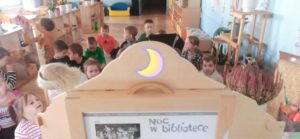 Dzieci z zapartym tchem oglądały teatrzyk kamishibai oraz wysłuchały bajki „Noc w bibliotece”. Maluchy zainspirowane opowieścią wspólnie tworzyły kolorowe ilustracje i chętnie opowiadały, co im najbardziej się podobało.