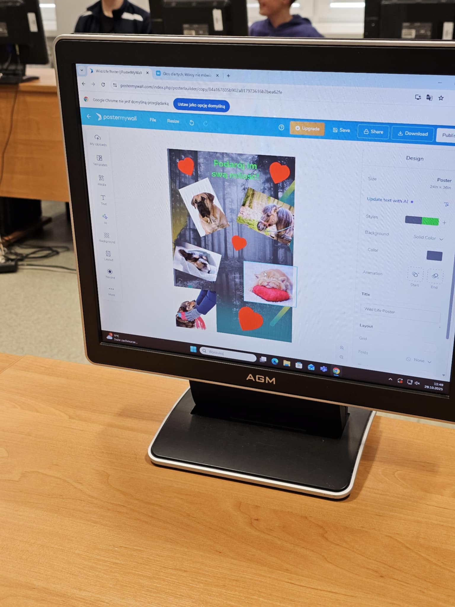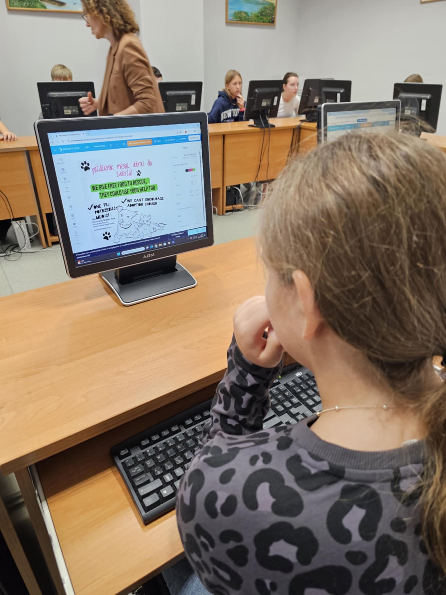 Pracując międzyprzedmiotowo (język polski, informatyka, ekologia, wychowanie), uczniowie analizowali przykłady plakatów społecznych, poznawali problemy ochrony zwierząt i tworzyli z wykorzystaniem platformy postermywall.com własne plakaty z przekazem edukacyjnym. Celem zajęć było kształtowanie empatii, odpowiedzialności i wrażliwości na potrzeby zwierząt. Powstałe prace nie tylko zachwyciły pomysłowością, ale też skłaniały do refleksji, że każdy z nas może być głosem tych, którzy sami mówić nie potrafią.