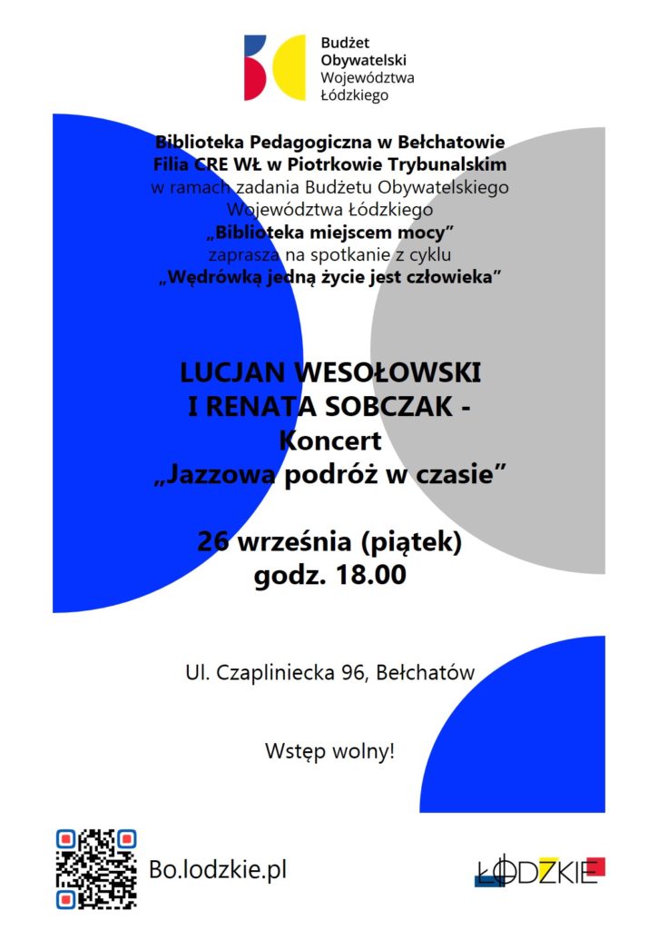 Zapraszamy na kolejne wydarzenie w ramach zadania „Biblioteka miejscem mocy” finansowanego z Budżetu Obywatelskiego Województwa Łódzkiego. Będzie to „Jazzowa podróż w czasie” – koncert Lucjana Wesołowskiego i Renaty Sobczak – w piątek 26 września o godz. 18.00.