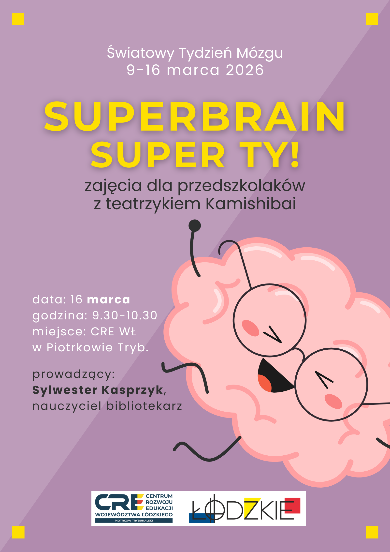 Zajęcia edukacyjne przeznaczone dla dzieci w wieku przedszkolnym. Podczas zajęć uczestnicy przeniosą się w świat autorskiej opowieści zaprezentowanej w teatrzyku Kamishibai, dzięki czemu poznają funkcjonowanie mózgu i jego „supermoce”. Zajęcia mają za zadanie wspierać rozwój wyobraźni, koncentracji oraz ciekawości poznawczej, a także kształtować umiejętność prawidłowego rozpoznawania, nazywania i wyrażania emocji.