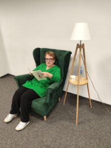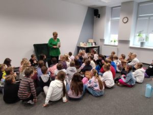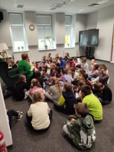 Pani Barbara czytała dzieciom swoje wiersze i przybliżyła uczniom świat poezji, a także zachęciła ich do wrażliwego patrzenia na świat. Wspólnie z nimi rozmawiała o tym, czym jest poezja i jak można opowiadać o świecie za pomocą słów i emocji. Dzieci słuchały z zainteresowaniem i chętnie dzieliły się swoimi przemyśleniami. Spotkaniu towarzyszyła wystawka książek poetki. Tomik „być blisko”, jak również inne zbiory Barbary Grajewskiej, są dostępne do wypożyczenia w naszej bibliotece – zapraszamy!
