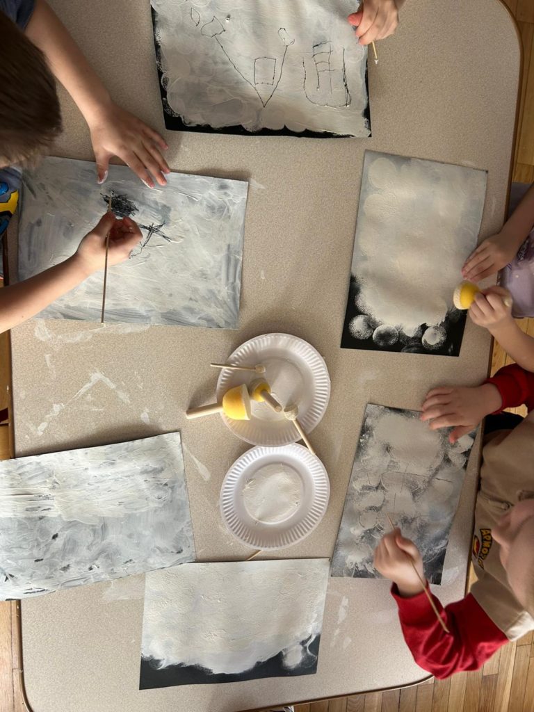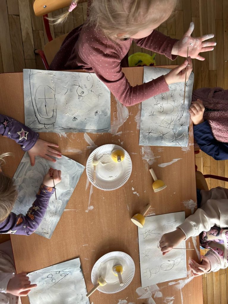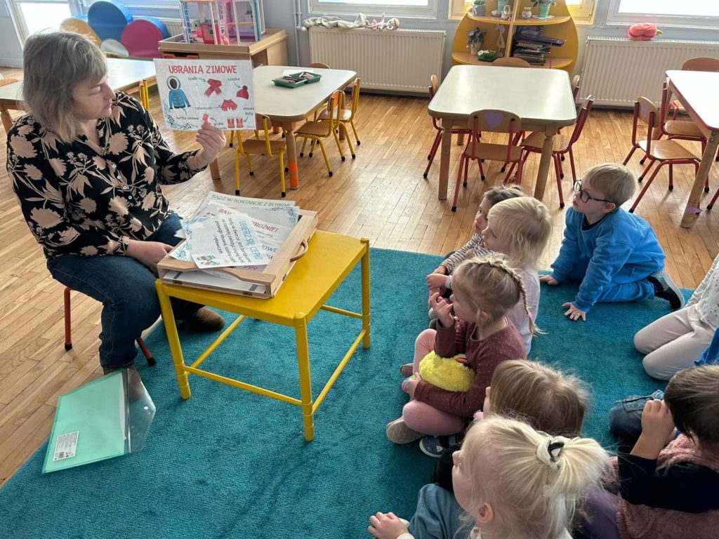 W pierwszym dniu ferii wybrałyśmy się z wizytą do Publicznego Przedszkola nr 5 w Radomsku. W czasie spotkania czytałyśmy „Zimowe opowieści” – teatrzyk kamishibai. Były również rozmowy o bezpieczeństwie podczas zimowych zabaw. W kolejnej części spotkania dzieci malowały zimowy pejzaż.